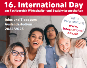 Wollen Sie mehr über das Auslandsstudium 2022/23 erfahren und neue Erfahrungen sammeln? Dann sind Sie beim International Day 2021 genau richtig! Neben nützlichen Tipps und Infos werden Ihnen interessante Workshops und Vorträge (via Zoom) zu ihrem Auslandsaufenthalt angeboten. Außerdem können Sie mehr über die unterschiedlichen Austauschprogramme, Partneruniversitäten, Stipendien, Sprachkurse und vieles mehr erfahren.